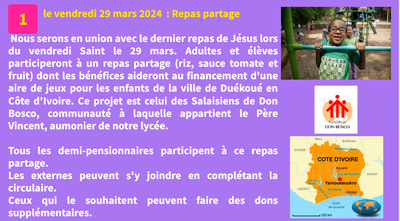 Des temps forts sont proposés pour préparer Pâques : chemin de croix, repas partage pour financer une aire de jeux en Côte d'Ivoire et célébration en l'église Ste Catherine.