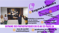 Une semaine ponctuée de diverses propositions en lien avec les mathématiques dont une magnifique expositions conçue et réalisée par les lycéens, élèves de Mme Darnel sur les femmes mathématiciennes remarquables pour montrer que la voie scientifique est ouverte aux filles...