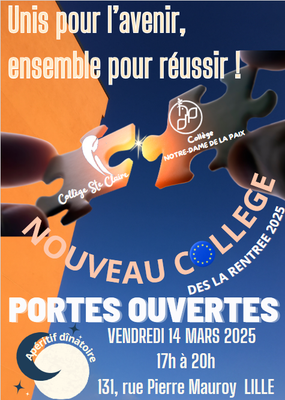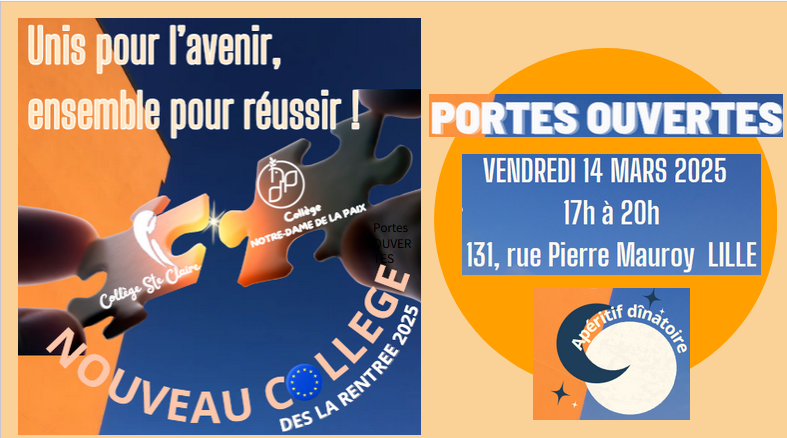 Nos portes ouvertes collège se tiendront en soirée avec apéritif dînatoire pour un moment d'échanges et de convivialité autour des avancées de notre projet de rapprochement. Rendez-vous de 17h à 20h au collège, entrée au 131 rue Pierre Mauroy à Lille.